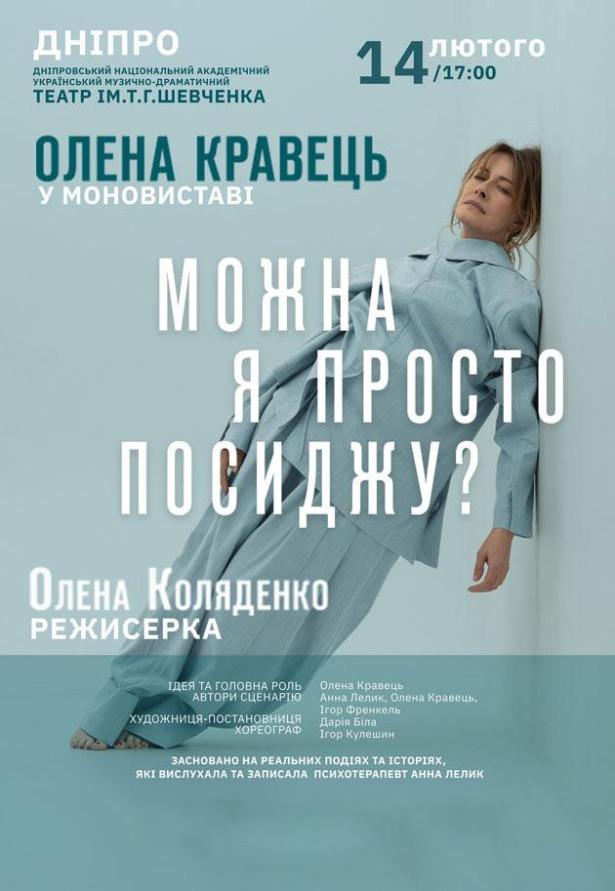 "Можна я просто посиджу?" - моновистава, в якій п’ять різних героїнь проходять шлях переродження. Всі жінки, яких у виставі грає Олена Кравець, приходять до особистих змін не стільки через війну, скільки через усвідомлення цінності життя - його неповторності та унікальності.
