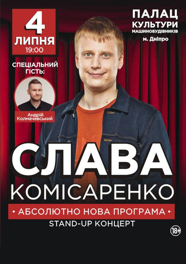 4 июля 2021 года известный комик и звезда Stand Up шоу Слава Комиссаренко выступит со своей абсолютно новой программой в Днепре! Концерт состоится в ДК «Машиностроителей». В концерте также примут участие Андрей Калмачевський и Коля Зырянов. Впервые перед украинской публикой Слава Комиссаренко выступил лишь в 2018 году, но сразу получил известность и успех. Сейчас он является одним из самых известных белорусских комиков, который популярен уже далеко за пределами своей страны.