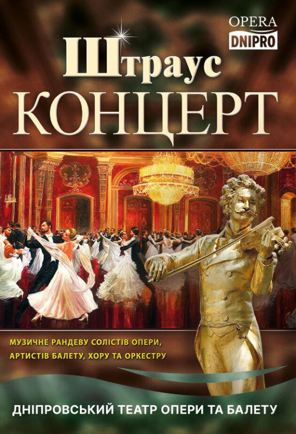 Безсмертні мелодії «короля вальсу» в нашому концерті – це поєднання музики, танців та вокальних номерів від солістів опери та артистів хору. А найголовніше – це гарний настрій. Тому що музика Штрауса – це бризки шампанського, вихор танцю та посмішок, який подарує всім можливість на деякий час поринути у світ віденського балу. Адже саме цього нам всім сьогодні не вистачає – відчуття миру, радості та легкості. В цей вечір на вас чекають не тільки улюблені вальси Штрауса, а також чардаші, польки, марші, арії та дуети з улюблених оперет. І авжеж – незабутні сюрпризи від постановників.